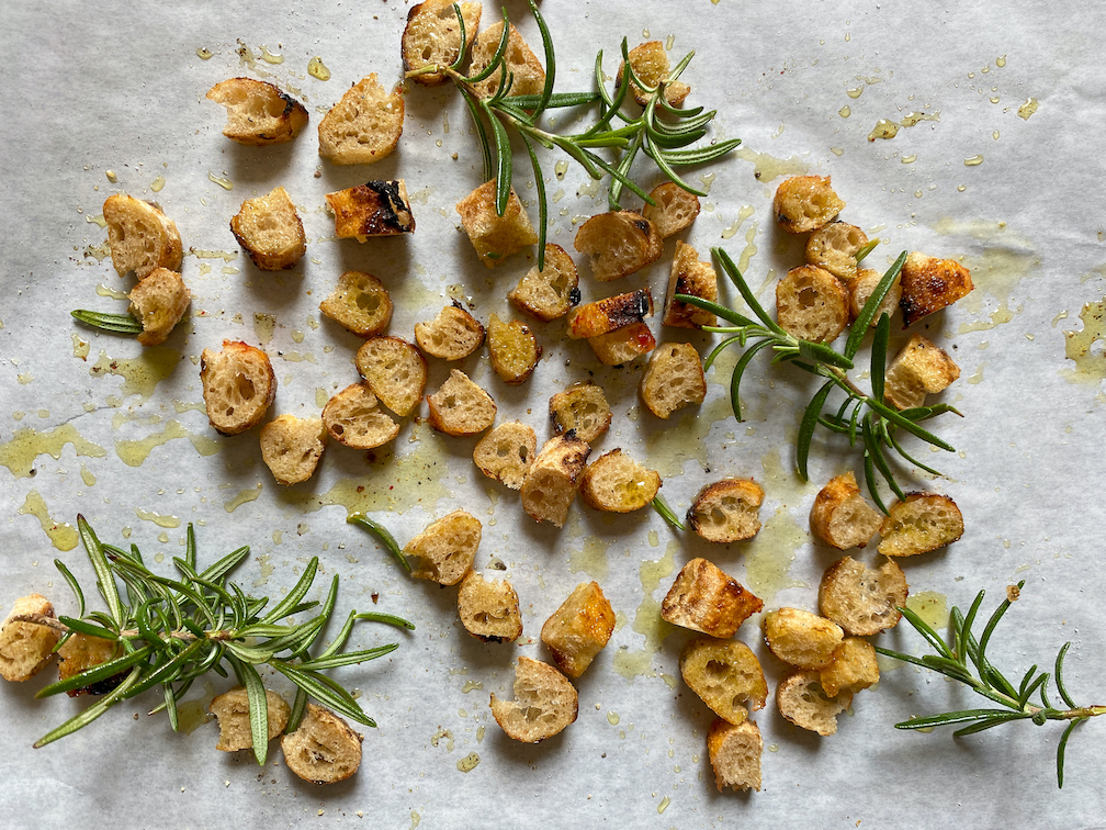 - Den Pizzarand in kleine Würfel schneiden und auf ein mit Backpapier ausgelegtes Backblech geben. Mit Olivenöl, Salz, Pfeffer einreiben. Ein paar Zweige Rosmarin mit auf das Backblech geben und alles für ca. 5-10 Minuten rösten.