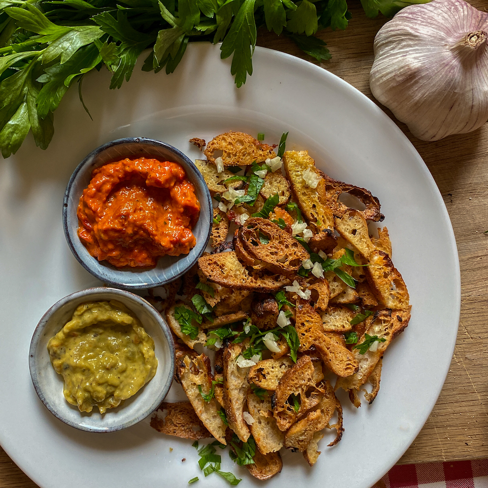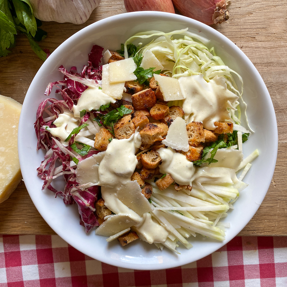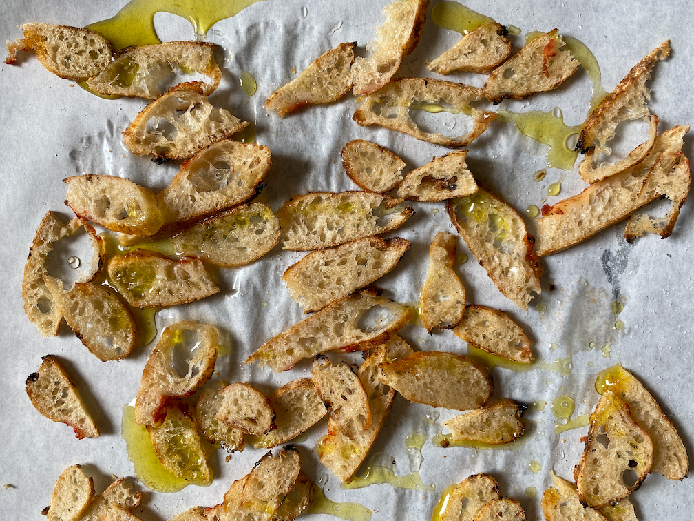 Pizzarand-Croutons mit Kohlsalat