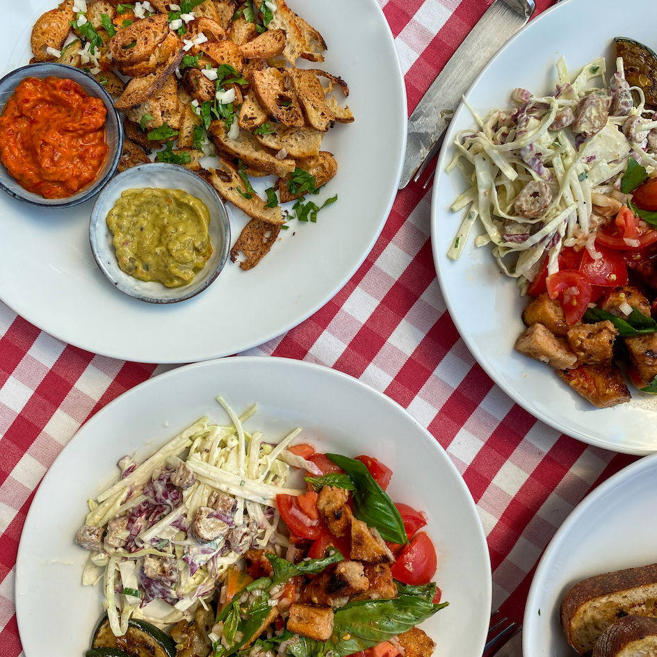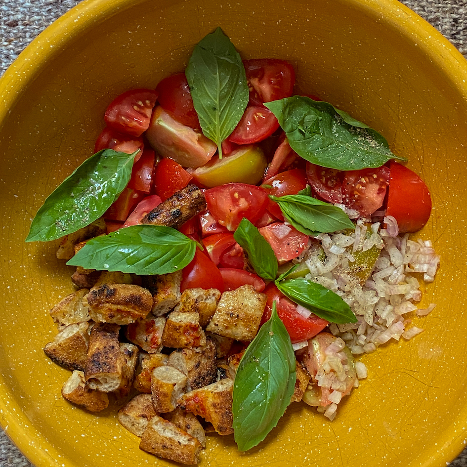 - Die Tomaten, waschen, würfeln und in eine Schüssel geben. Den angerösteten Pizzarand dazugeben, gehackte Schalotten, Olivenöl, Weißweinessig und eine Handvoll frischen Basilikum hinzufügen. Alles gut miteinander vermengen und mit Salz und Pfeffer abschmecken. Fertig!