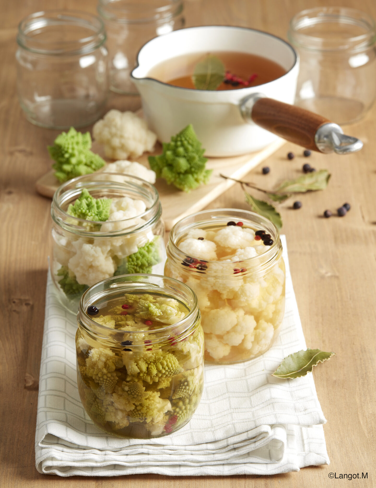 Den Blumenkohl putzen, waschen und in Röschen teilen. Diese zwei Minuten lang in einem Topf mit kochendem Wasser und einem Schuss Essig blanchieren. Sofort in eine Schüssel mit Eiswasser tauchen. Anschließend auf einem sauberen Tuch trocken tupfen. Essig, Wasser, Zucker und Gewürze in einen Topf geben und zum Kochen bringen. Die Röschen in die zuvor abgekochten Gläser geben und mit dem Kochenden Essigwasser aufgießen, bis alles bedeckt ist. Das Glas fest verschließen und warten bis es vollständig abgekühlt ist.