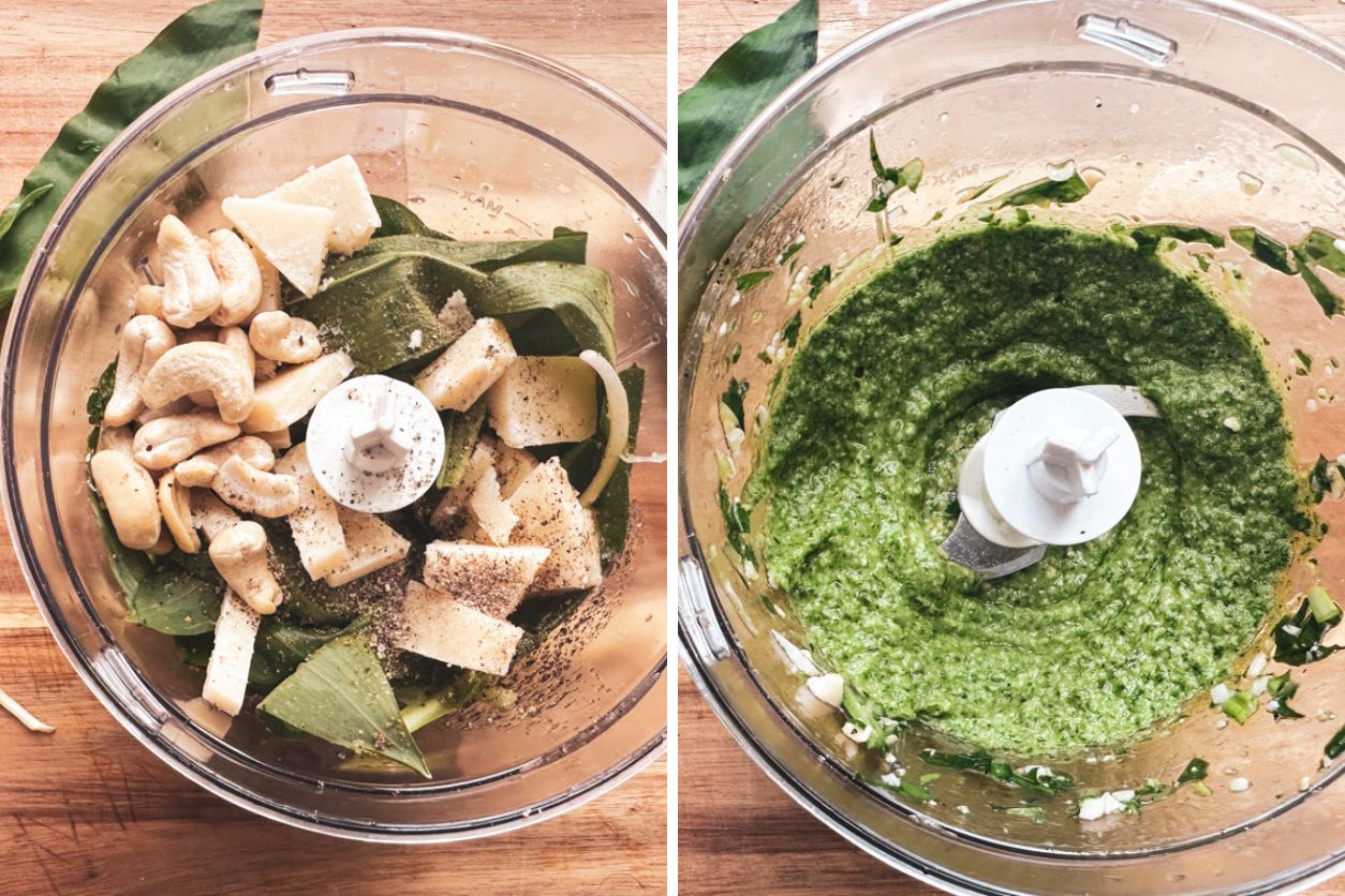 - Bärlauch waschen und schneiden und zusammen mit dem Käse, Nüssen und Öl in einen Mixer geben.