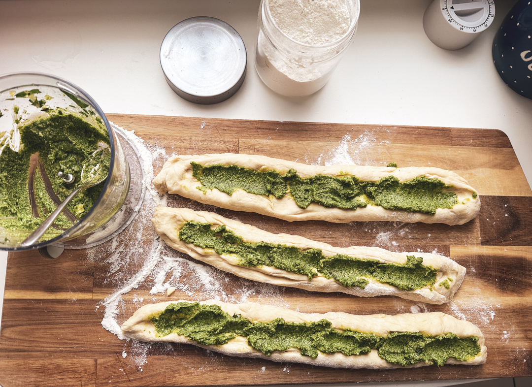 - Die Teigstücke zu länglichen Rollen formen und nebeneinander legen. Mit dem Bärlauchpesto bestreichen und zu einem Zopf flechten.