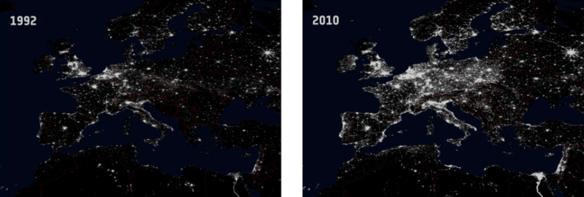 Entwicklung der Lichtverschmutzung in Europa zwischen 1992 und 2010 laut Satellitenbildern der Europäischen Weltraumorganisation