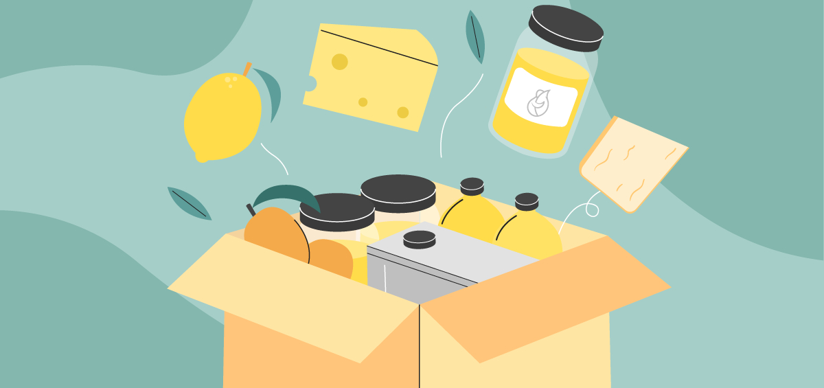 Grafik eines Kartons mit Öl, Käse, Zitrone, Honig und Mangos