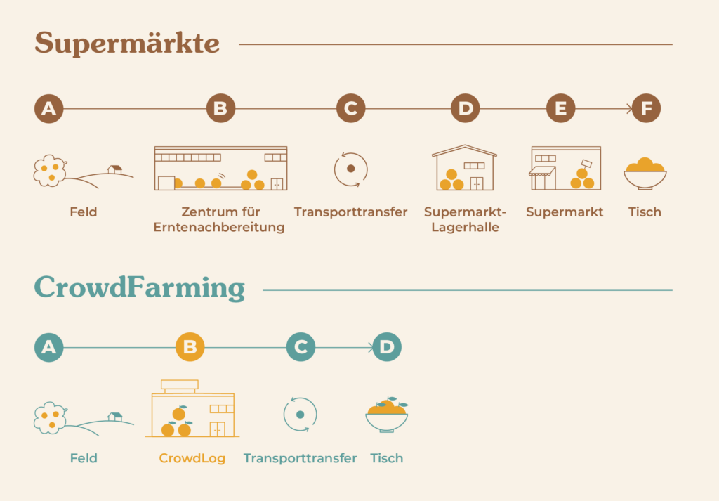 Bei CrowdFarming beginnt der Ernteprozess und die Reise der Produkte zum Haus des CrowdFarmers erst, wenn dieser eine Bestellung aufgibt. Der Landwirt, der über CrowdFarming verkauft, erntet auf Abruf, was bedeutet, dass die Orangen bei CrowdFarming am Baum warten und nicht im Kühlhaus. Auf diese Weise braucht ein CrowdFarming-Produkt im Durchschnitt 5,5 Tage, um vom Baum zu dir nach Hause zu gelangen, im Gegensatz zum Supermarktmodell, bei dem Orangen bis zu zwei Monate im Kühlhaus verbringen können.
