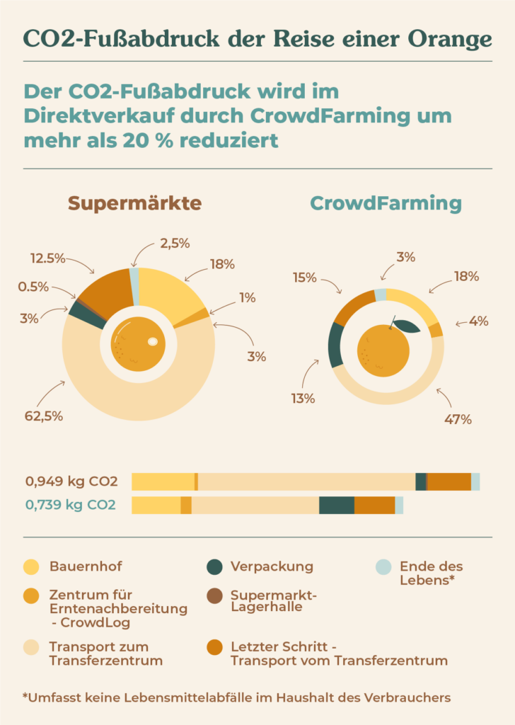 Mit der Absicht, CrowdFarmern eben eine Alternative zu bieten – nicht nur eine gerechtere und nachhaltigere Einkaufsalternative, sondern auch eine, die ihre Auswirkungen in Zahlen ausdrückt – haben wir im Jahr 2022 beschlossen, eine Studie durchzuführen, um die tatsächlichen Auswirkungen des CrowdFarming-Modells in Bezug auf den CO2-Fußabdruck und die Lebensmittelverschwendung zu quantifizieren. In der Studie wurde der Weg der Orange von der Produktion auf dem Bauernhof bis zum Verbraucher zu Hause berücksichtigt und mit der Lieferkette für Bio-Lebensmittel im Supermarkt verglichen. Dabei haben wir natürlich mit einem unserer Vorzeigeprodukte begonnen, mit dem alles angefangen hat: Orangen.