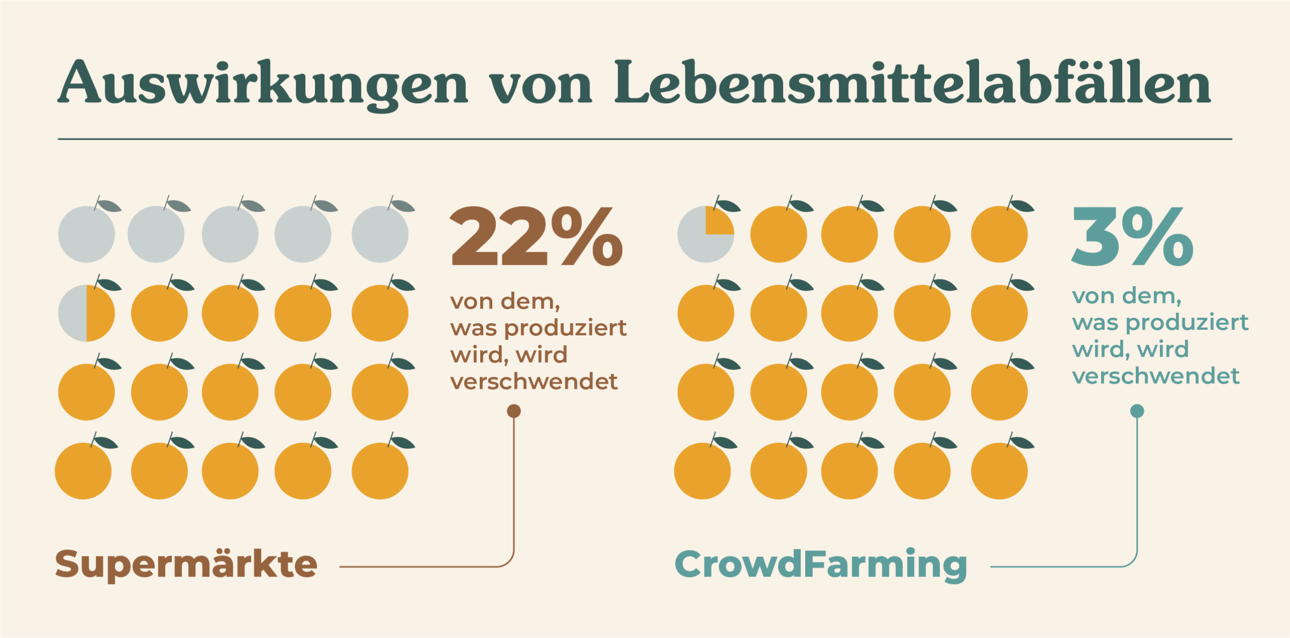 In diesem Zusammenhang haben wir festgestellt, dass in der Lieferkette der Supermärkte für jede 100 kg, die bei den Verbrauchern zu Hause ankommen, 30 weitere produziert und verschwendet werden, bevor sie ihren endgültigen Bestimmungsort erreichen. Im Gegensatz dazu würden im CrowdFarming-Szenario weniger als 3 kg Orangen pro 100 kg, die den Verbraucher erreichen, aufgrund von Lebensmittelsicherheitsproblemen (z. B. verdorbene Produkte) verschwendet.