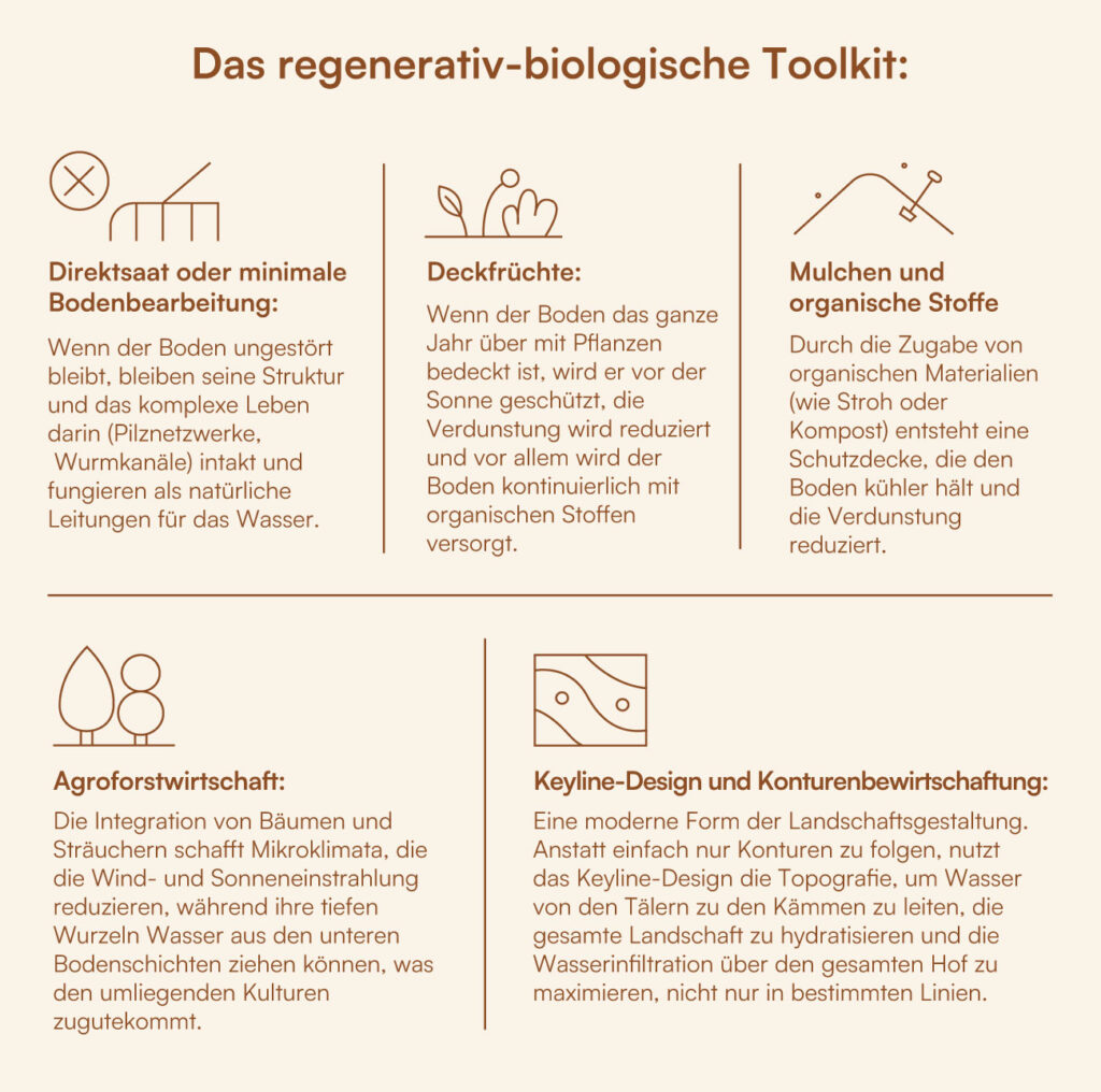 Die gute Nachricht: Gesunde Böden wirken wie Schwämme. Eine Steigerung des organischen Bodengehalts um nur 1 % ermöglicht es, pro Hektar 75.000 Liter mehr Wasser zu speichern und die Infiltrationsrate um bis zu 256 % zu verbessern. Höfe wie La Junquera, BioSanz und Tropiterráneo beweisen es bereits: Sie sind bei Überschwemmungen resilienter, halbieren den Bewässerungsbedarf und verwandeln sogar leblos wirkende Wasserbecken in blühende Ökosysteme.