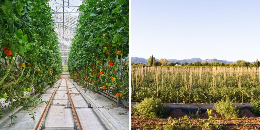 Die Freilandproduktion ist bezüglich der Flächennutzung weniger effizient als der Anbau in Gewächshäusern, da mehr Fläche für die gleiche Produktionsmenge benötigt wird. In Gewächshäusern sind die Umweltfaktoren leichter zu kontrollieren, was zu einer höheren Produktivität führt. Sie hat aber wiederum Nachteile in Bezug auf die Verringerung der Treibhausgasemissionen und des Gebrauchs von Kunststoff im Anbau selbst, während die Nutzung von Land- und Wasserressourcen weniger effizient ist, als die im Gewächshaus.
