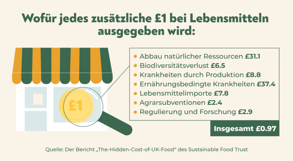 Im Bericht „The-Hidden-Cost-of-UK-Food“ des Sustainable Food Trust wurde festgestellt, dass die Lebensmittel, die die Menschen im Vereinigten Königreich konsumieren, sie fast doppelt so viel kosten, wie auf ihrem Kassenbon steht. Aus dieser Studie ging hervor, dass pro 1 £, der im Vereinigten Königreich an der Kasse ausgegeben wurde, zusätzlich 1 £ an einer zunächst verborgenen Stelle ausgegeben wurde.