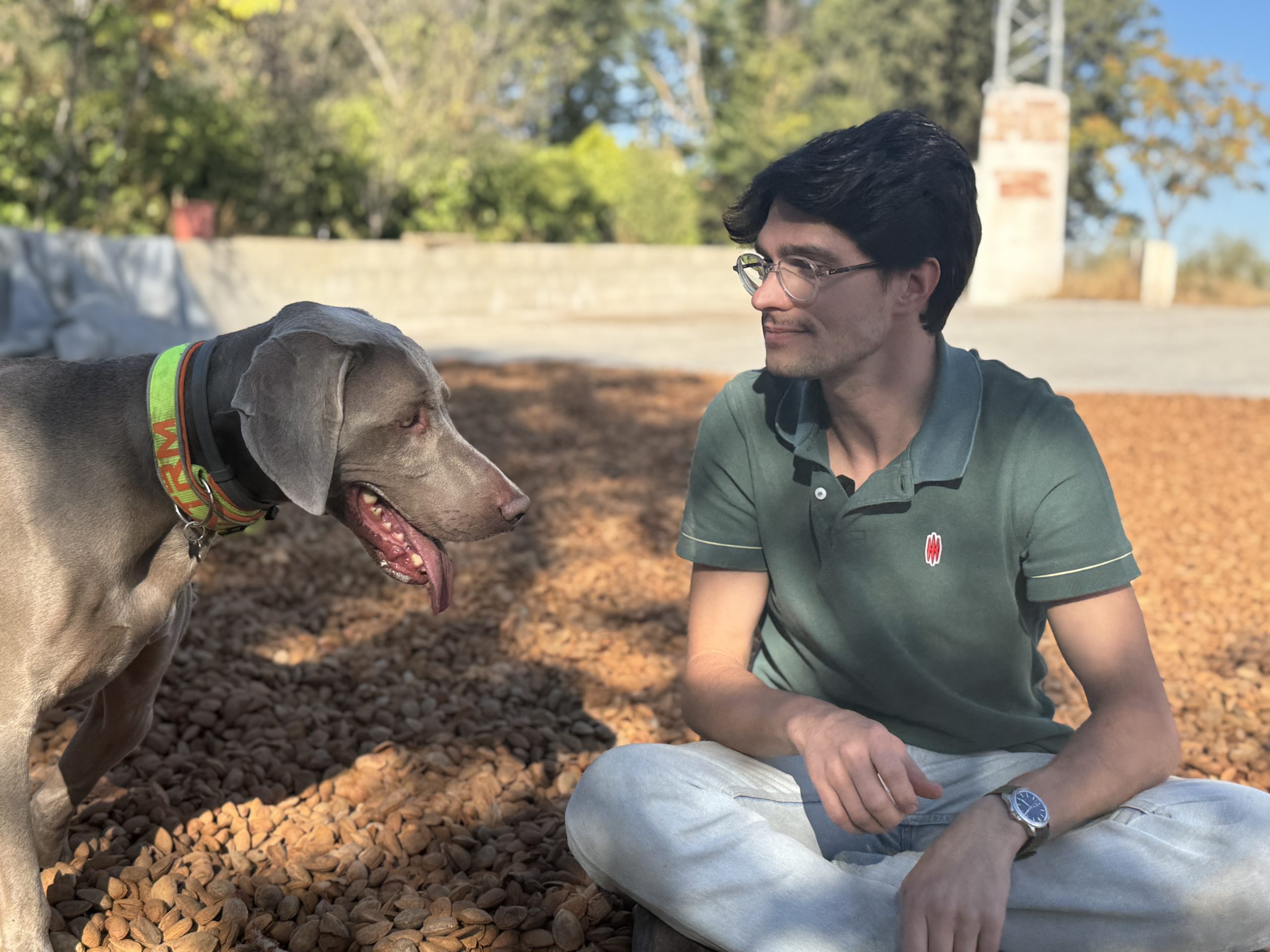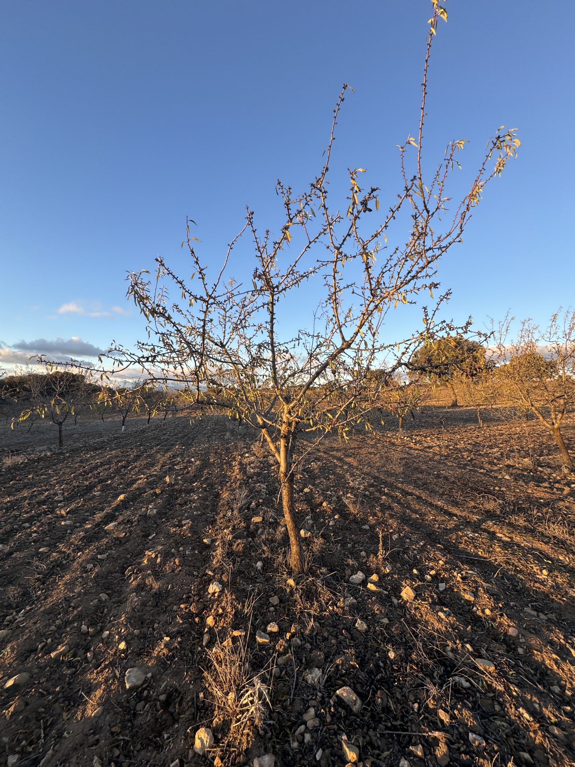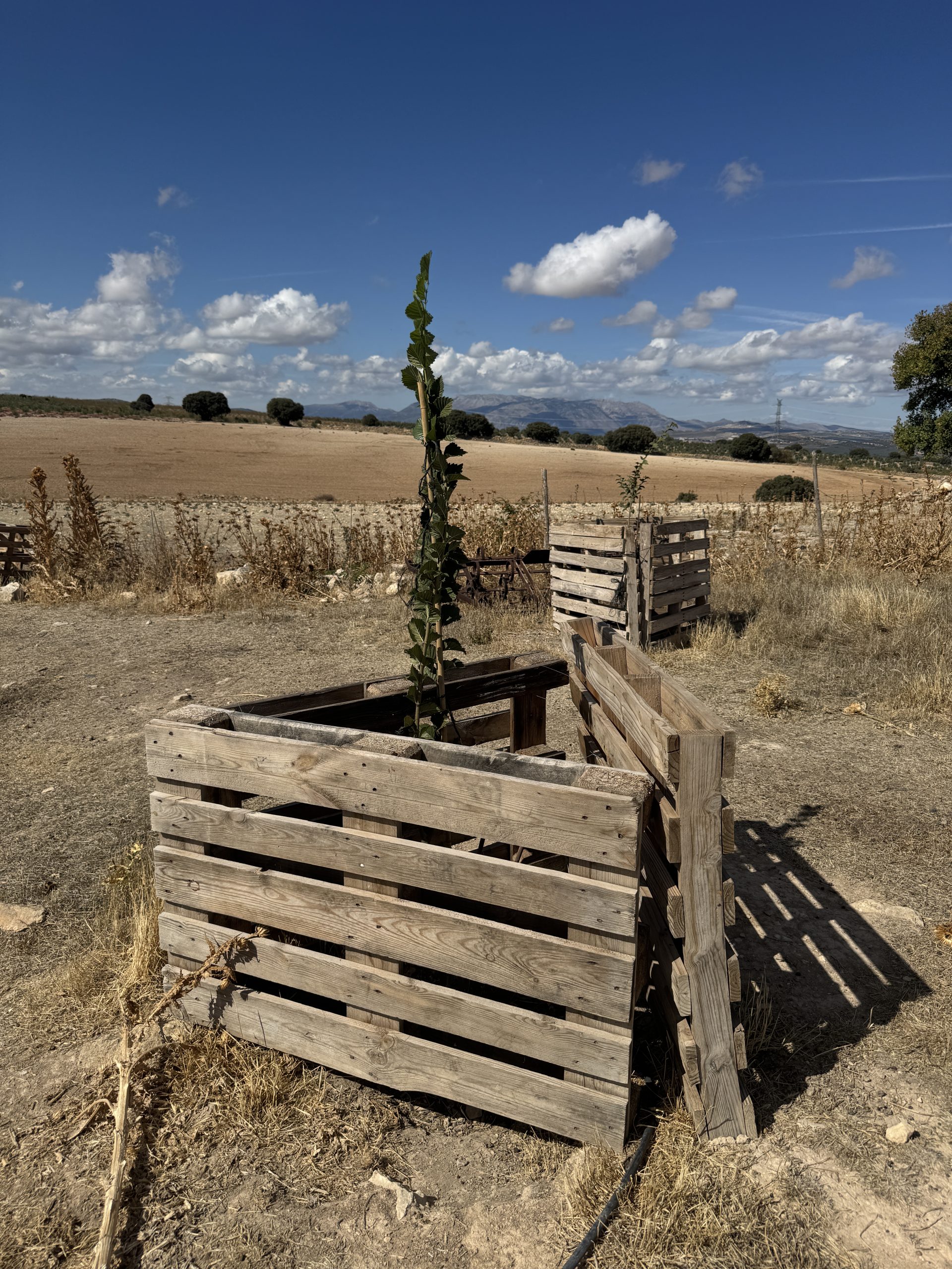 Vor einigen Jahren begann Pedro mit einem wegweisenden Agroforst-Projekt. Dabei designte er zusammen mit seinem Vater ganzheitliche Konzepte: Die Bäume spenden seinen Schafen Schatten, ihre Früchte sind bei ihnen besonders beliebt, ihr Dung wiederum nährt den Boden. Da Granada zu einer der trockensten Regionen Spaniens gehört, ist ein gesunder Boden, der jeden Tropfen Regenwasser im Boden speichern kann, ein Schlüsselaspekt im Management des Hofes. Pedro nutzt ein einfaches, aber effektives Mittel: Er verwendet die Mandelschalen als Mulch, um die Feuchtigkeit im Boden zu halten und Verdunstung zu reduzieren. Er erklärte mir aber auch, dass zu viel Mulch dem Boden auch schaden kann, weshalb er hier mit viel Fingerspitzengefühl vorgeht. Um die jungen Bäume vor seinen neugierigen Schafen zu schützen, nutzt er ganz pragmatisch Europaletten als Schutzgitter. 🐑