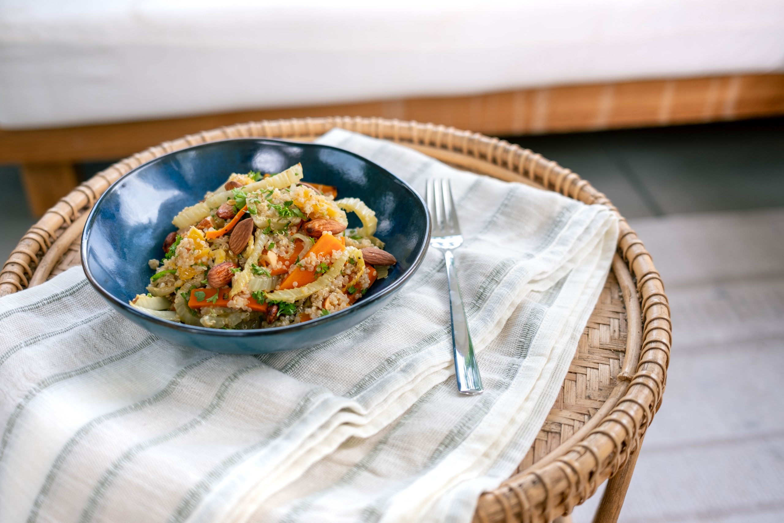 Fenchel ist ein beliebtes saisonales Sommergemüse. Seine ätherischen Öle sind gut verträglich und wirken krampflösend. Zudem ist Fenchel reich an Kalzium, Kalium, Magnesium und Eisen – in Kombination mit Quinoa eine perfekte Grundlage für eine gesunde Mahlzeit.