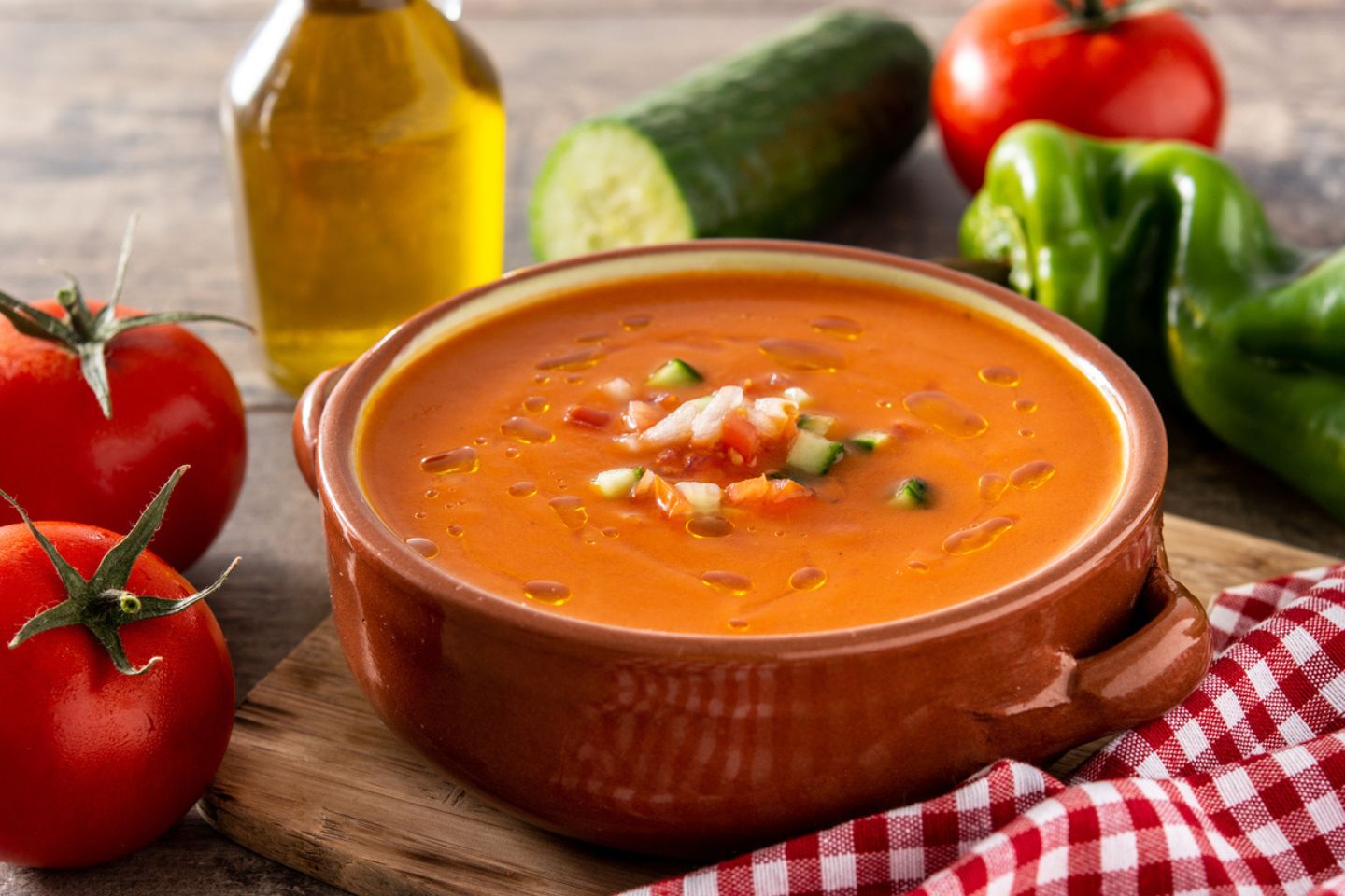 Gazpacho stammt ursprünglich aus Andalusien und wurde dort von den alten Bauern zubereitet, um getrocknetes Brot vom Vortag zu verbrauchen. Dafür weichte man das Brot in Wasser auf, presste es mit der Hand aus und mischte es mit ebenfalls von Hand gepressten Tomaten, zerdrücktem Knoblauch, Salz, Öl und Essig.
