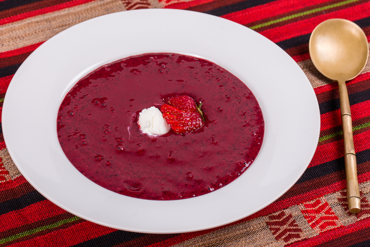 Dieses süße Süppchen sieht durch seine satte Farbe nicht nur toll aus, sondern schmeckt auch erfrischend gut. Serviert mit einer selbstgemachten Vanillesoße ist die Suppe eine köstliche Erfrischung an heißen Sommertagen.