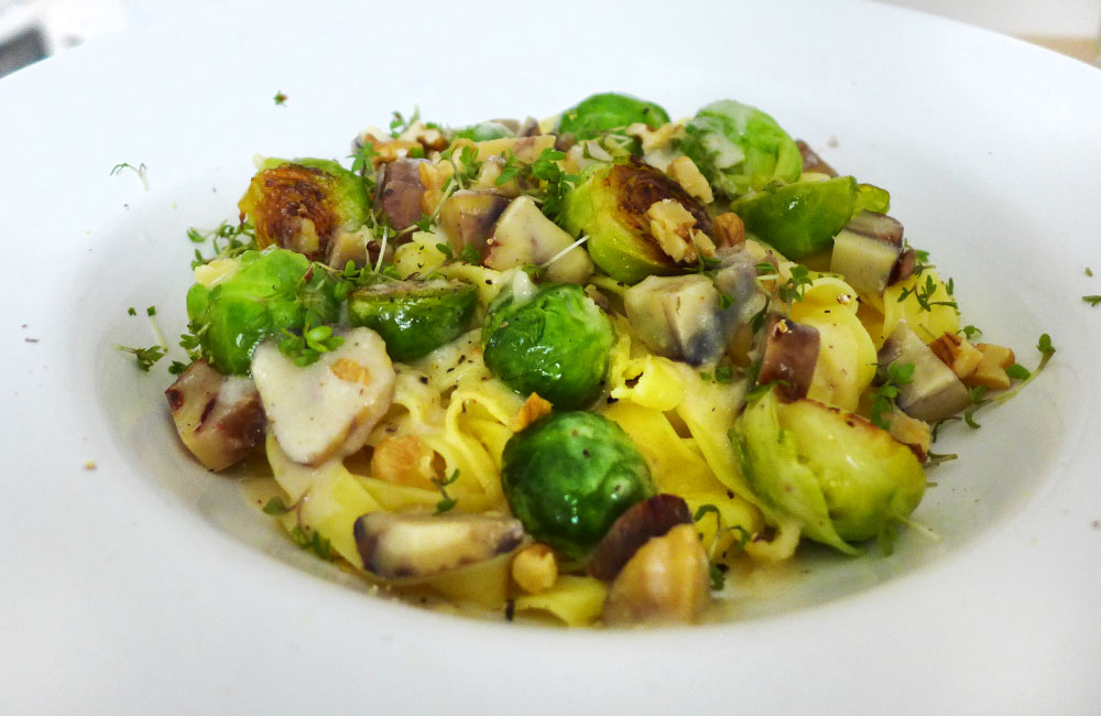Pro Portion werden gebraucht: 1 bis 2 Hände Rosenkohl, 4-5 Maronen (vorgegart), ein paar Walnüsse, 50ml Sahne (oder vegane Hafer-Cuisine), 1/2 TL Meerrettich (frisch gerieben oder im Glas), halbe Bio-Zitrone, 80g Bandnudeln, Kresse zum Garnieren, 1-2 EL Öl zum Braten