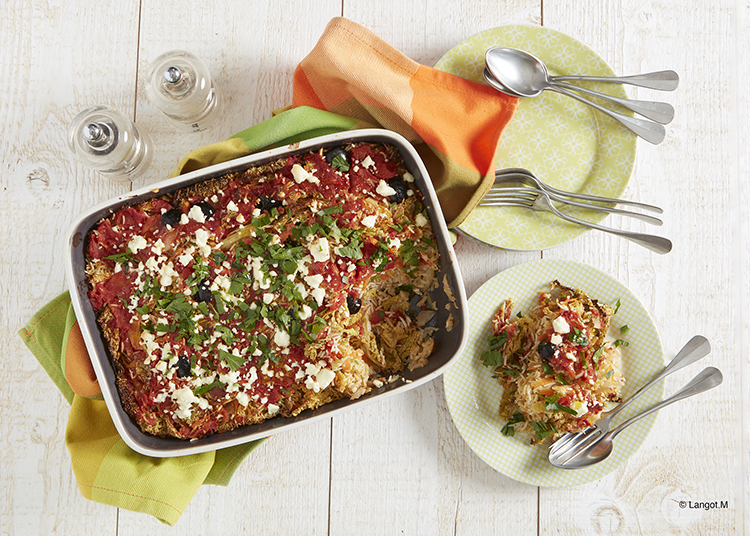 • Füge den abgetropften Reis und die Oliven hinzu. Gut vermengen und in die Auflaufform füllen.