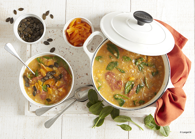 • Die Suppe in Teller füllen, mit Mimolette-Spänen und Kürbiskernen garnieren. Mit einem Spritzer Kürbiskernöl und einer Prise Pfeffer verfeinern.