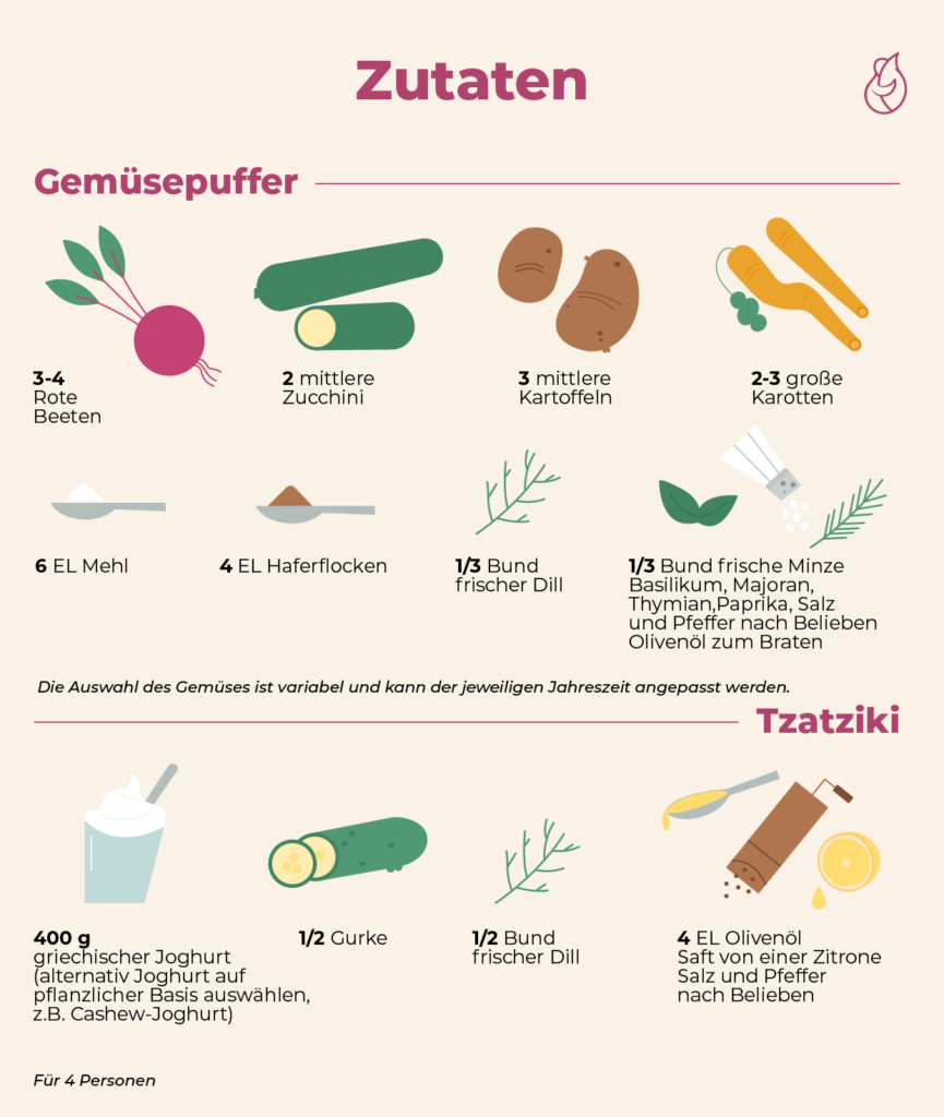 - Die Gemüsepuffer mit dem Tzatziki servieren.