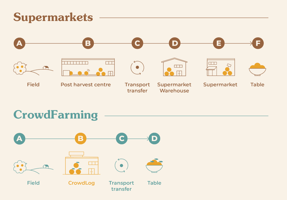 Through our sustainability and impact team’s comparative study of an orange’s journey from Valencia to Berlin in the CrowdFarming vs. conventional supply chain, we have found that CrowdFarming’s efficiency efforts result in a 22% reduction of the emissions produced compared to the supermarket model. Have a look at our blog post about the study here.