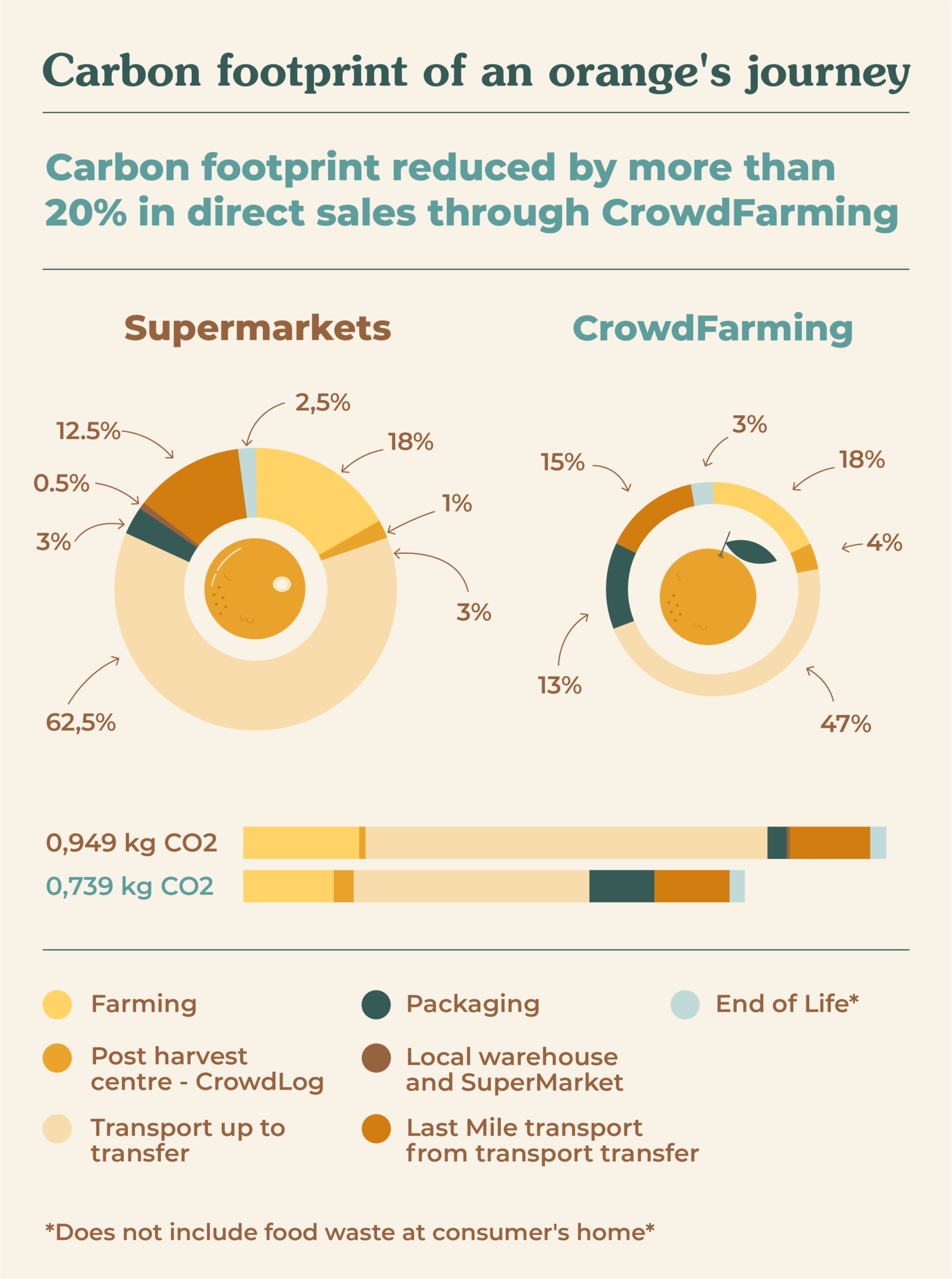 We can see that the CO₂ emissions data for CrowdFarming equates to 0.74 kg CO₂ emitted throughout the entire supply chain; 22% less than the 0.95 kg CO₂ emitted in the supermarket supply chain.