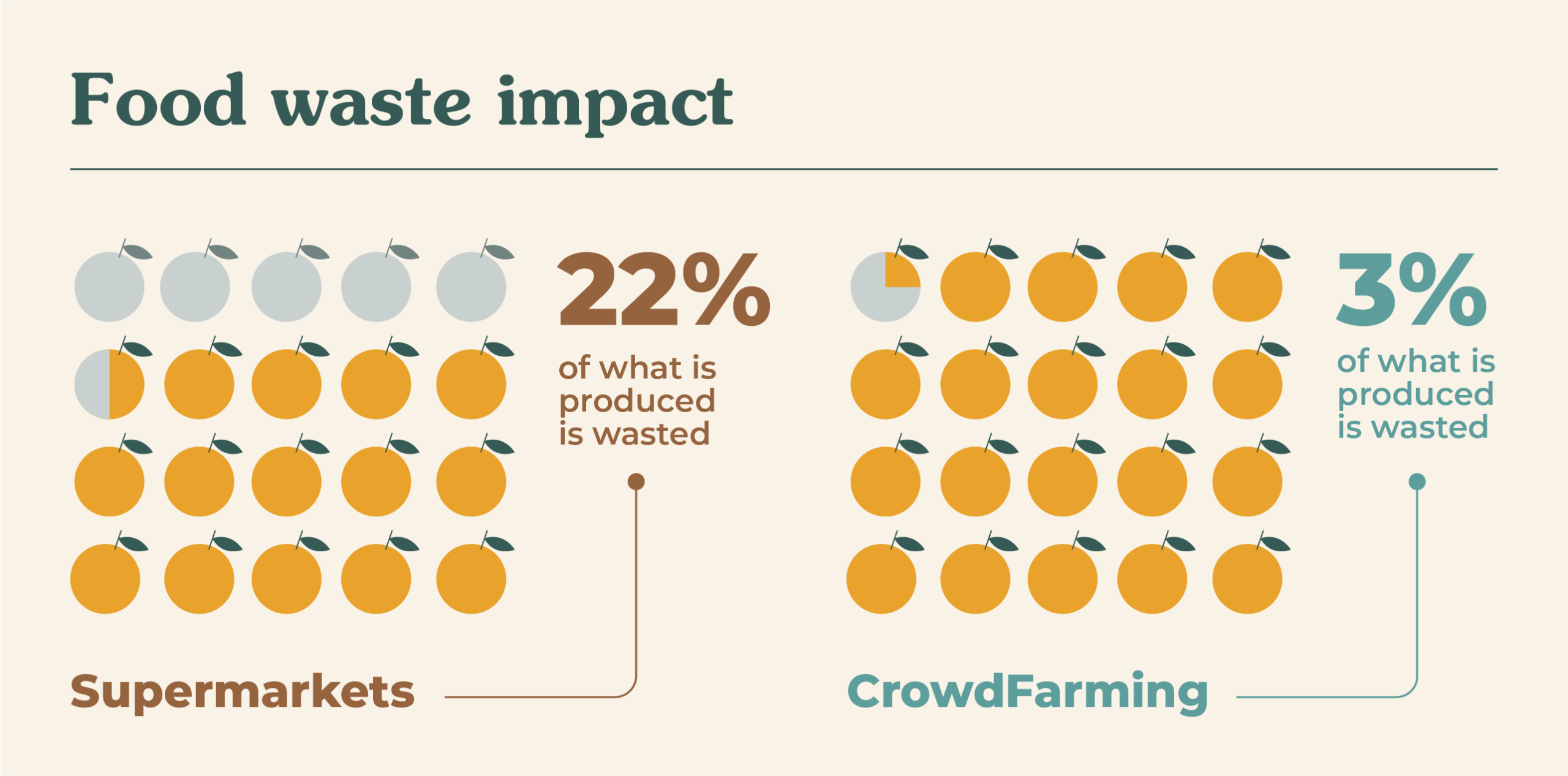 Figure 3. Percentage of food waste generated in the production of 25 oranges along the supermarket supply chain (in brown; 5.5 out of 25 oranges, 22% of the total), and the CrowdFarming model (in green; 0.25 out of 25 oranges, 3% of the total).