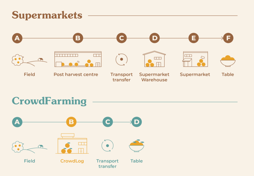 In the case of CrowdFarming, the harvesting process and the journey of the produce to the CrowdFarmer’s home begins only when a CrowdFarmer places an order.  The farmer selling in CrowdFarming harvests on demand, which means that the oranges in CrowdFarming wait on the tree – not in cold storage. In this way, a CrowdFarming product will take on average 5.5 days to reach your home from the tree, in contrast to the supermarket model, where oranges can spend up to 2 months in cold storage.