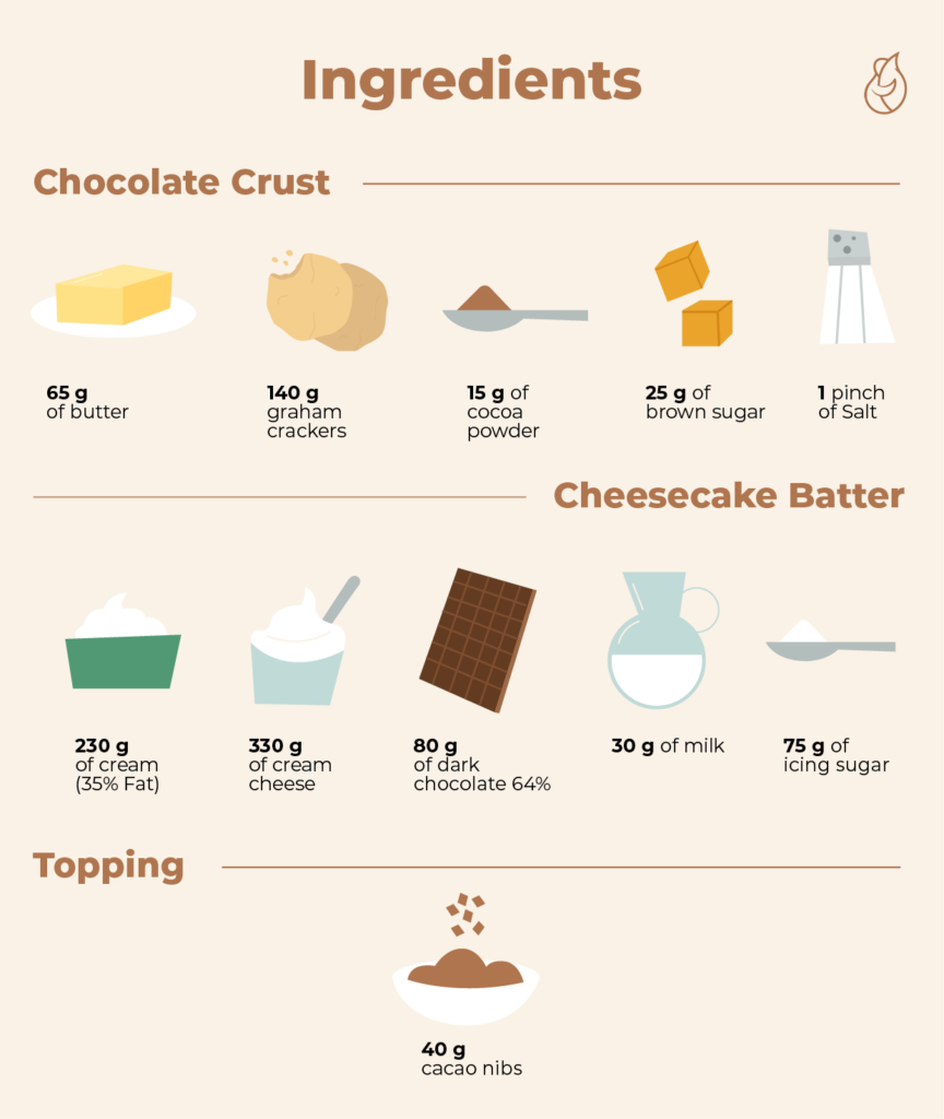 | 1) Lightly coat a 6-inch springform pan with nonstick spray or a thin layer of oil. Set aside. 2) Melt the butter and process your graham crackers into fine crumbs. 3) In a large bowl evenly combine the butter, graham cracker crumbs, cacao, sugar, and salt. 4) Press the mixture firmly into the bottom and up the side of the prepared pan. 5) Place the pan in the freezer while you prepare the filling. Cheesecake Batter: 6) Beat the cream in a bowl using a mixer fitted with the whisk attachment on medium-high speed until it becomes stiff. Remove the whipped cream from the mixing bowl and set aside. 7) In the same mixing bowl, using the same whisk attachment, mix the cream cheese together with the powdered sugar on medium speed for 2 minutes, or until smooth and creamy, scraping the sides of the bowl as needed. 8) Warm up the milk and melt the chocolate in it, then add the mixture to your bowl. 9) Using a rubber spatula, fold in the whipped cream evenly, making sure to scrape the sides and bottom of the bowl completely. 10)Spread the cheesecake filling into the chilled crust and smooth out the top with a spatula. 11) Cover and chill for 4 hours or overnight. 12) Sprinkle with cocoa nibs. |