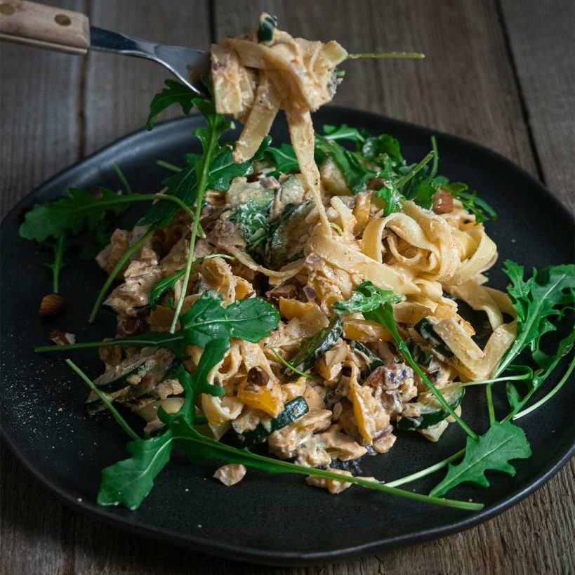 This creamy pasta recipe uses ‘pesto rosso’, made from sun-dried tomatoes instead of basil. The almonds give a nice crunch and the rocket adds a bit of spiciness. You can play around with the amount of cream; if you want a lot of sauce you can add a bit more.