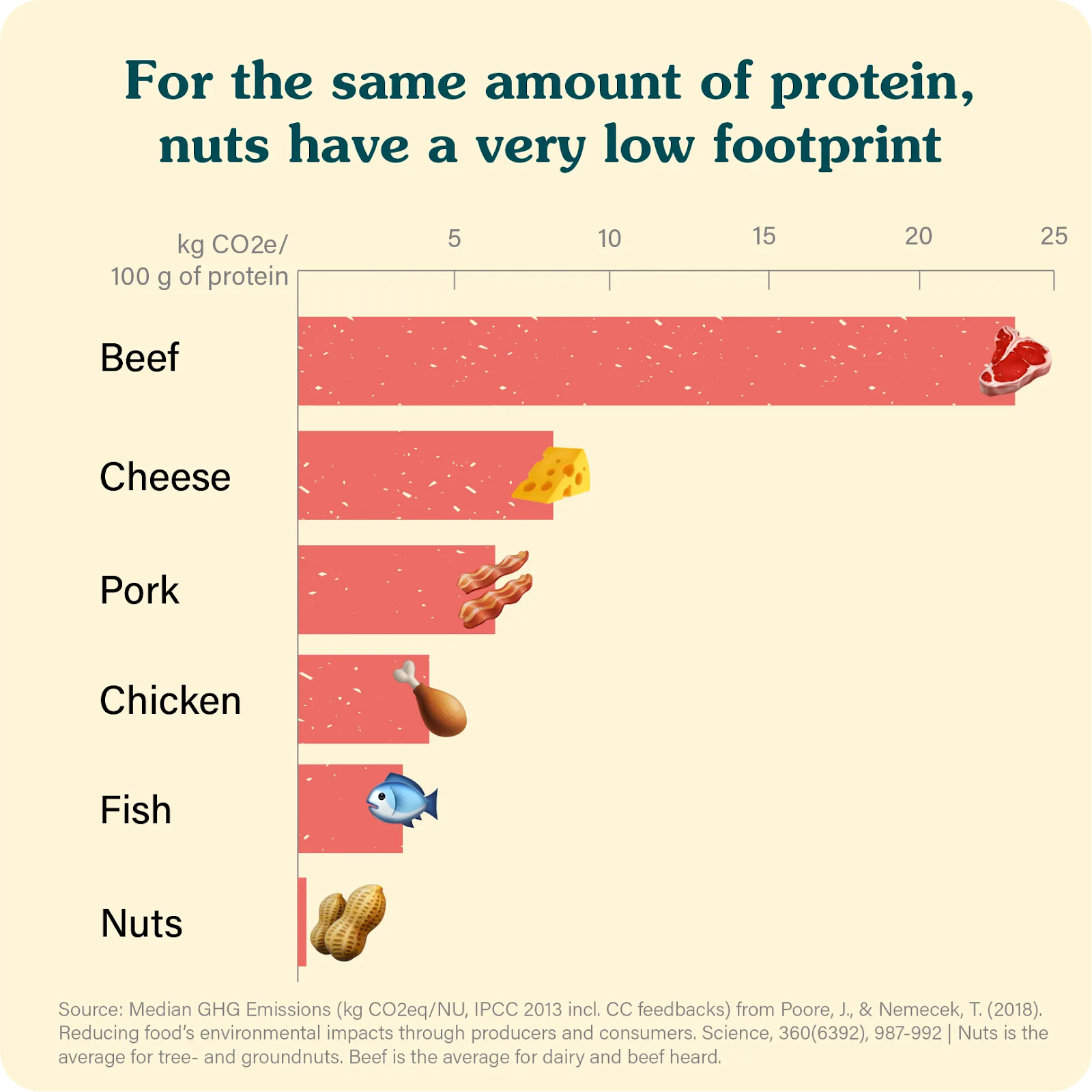 One of the reasons to eat more nuts is because of their high protein content. If you compare nuts to other high protein foods and look at their CO2 impact, nuts have the lowest impact on the climate.