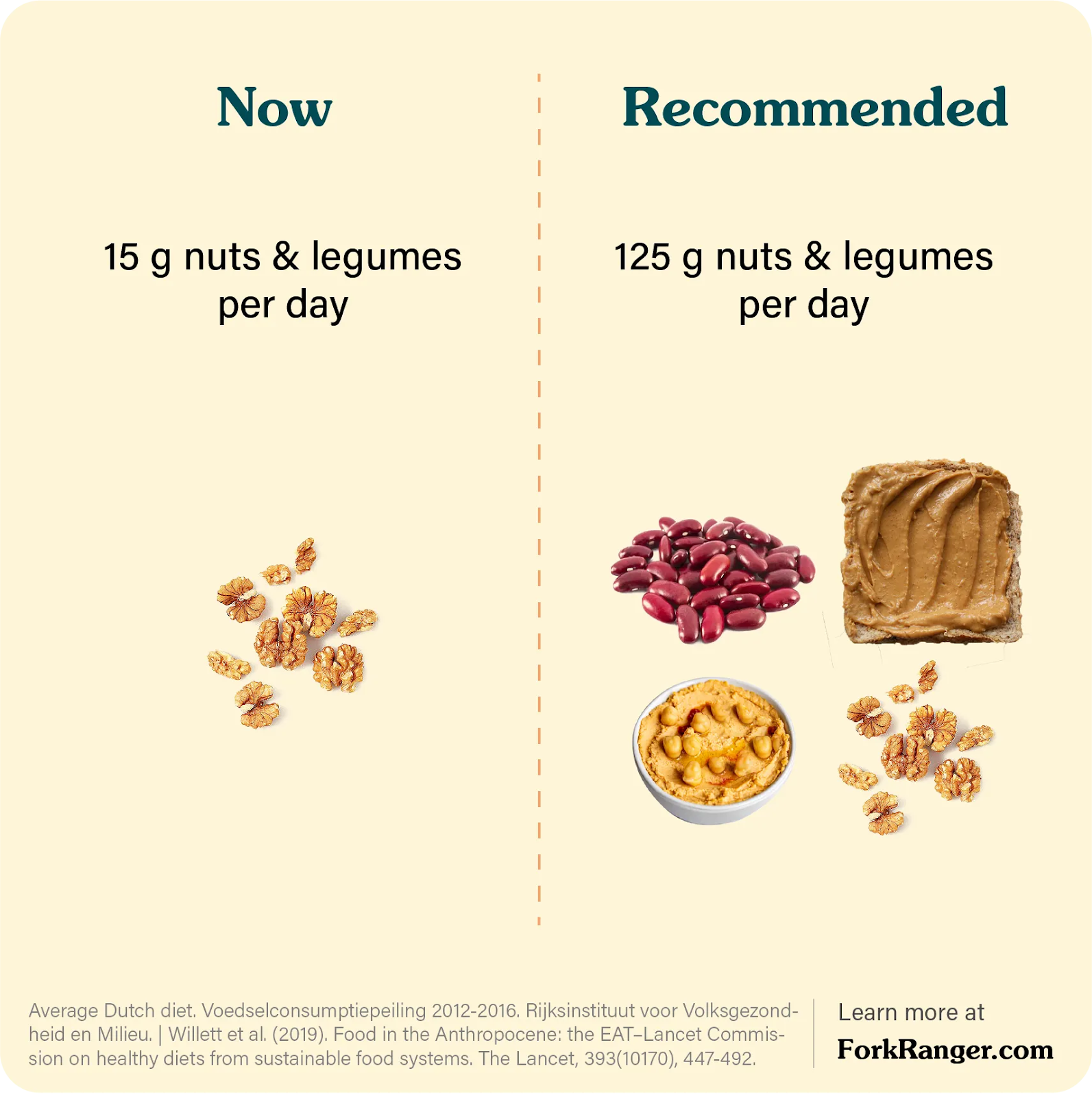 Besides nuts, legumes are in a similar position: they also provide plenty of protein, but nowadays, we eat too little of them. We need to increase our consumption of these two great foods by a factor of 8.