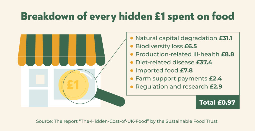 The report “The-Hidden-Cost-of-UK-Food” by the Sustainable Food Trust finds that in the UK, the food people eat costs them almost twice as much as appears in their shopping bills. They did a study that found that in the UK, for every £1 spent at the check-out, another £1 was spent in hidden ways.