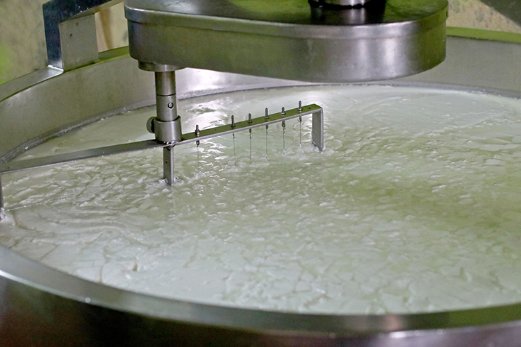 Cuajado: Una vez que la leche ha sido pasteurizada y que alcanzamos temperaturas de aproximadamente 30º, añadimos el cuajo. Utilizamos cuajo microbiano, lo cual hace que nuestros quesos sean aptos para personas que siguen un patrón alimentario vegetariano. Esto es importante, porque muchos quesos se elaboran con cuajo de procedencia animal.