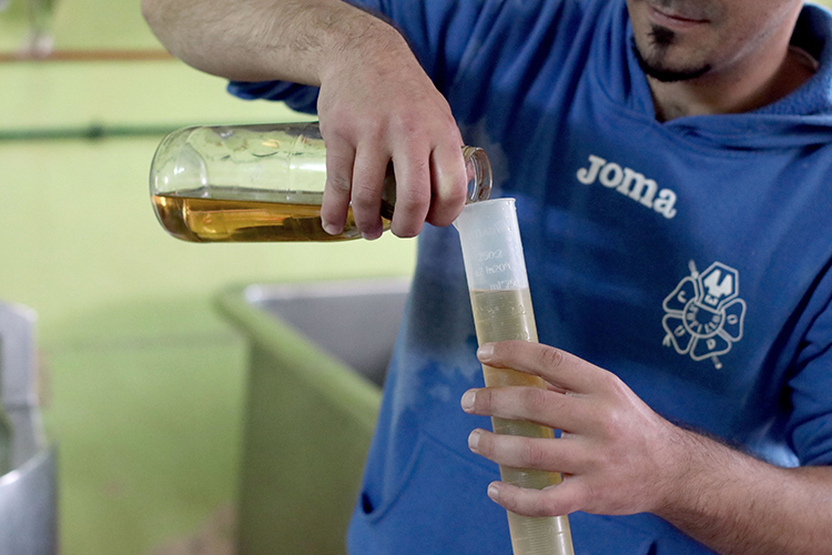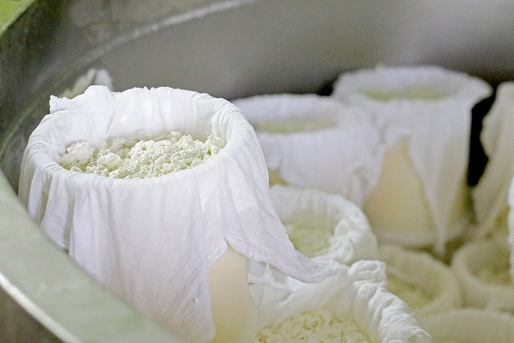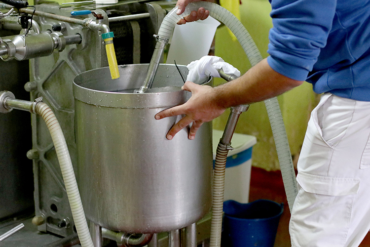 Separación del suero: Como decíamos, el corte facilita que la parte coagulada precipite al fondo y es entonces cuando se lleva a cabo la separación del suero, que será materia prima para elaborar requesón. El sobrante, se dona a ganaderos de la zona para alimentar animales, cerrándose así un circuito sostenible de aprovechamiento de recursos.