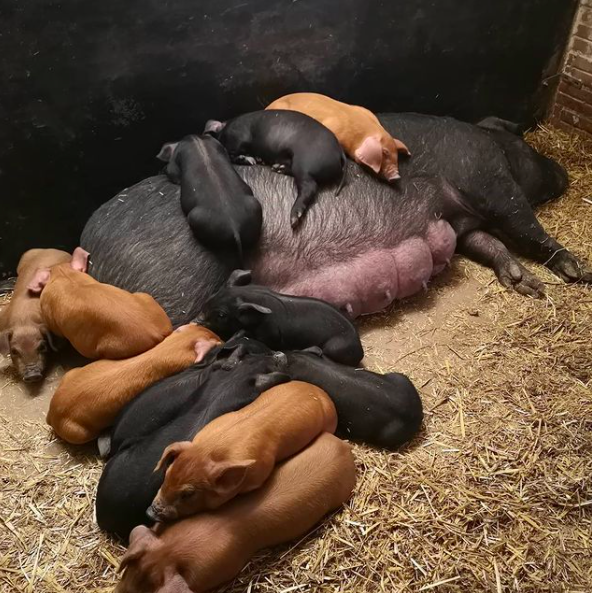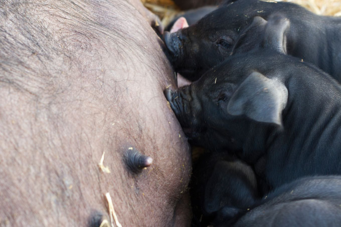 Es realmente impresionante verlo porque la cerda está muy consciente de que está pariendo y todo fluye bastante mejor que cuando medicalizas y controlas el parto. Es muy importante señalar que cuando nacen los lechones no les cortamos ni colas ni dientes [una práctica que, tristemente, sí es habitual en el porcino convencional], y así evitamos un estrés importante para el animal.