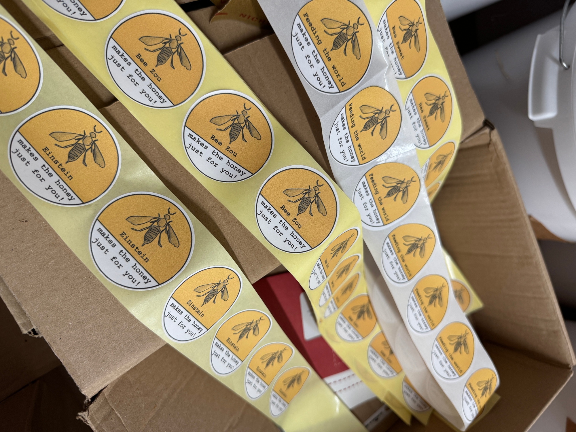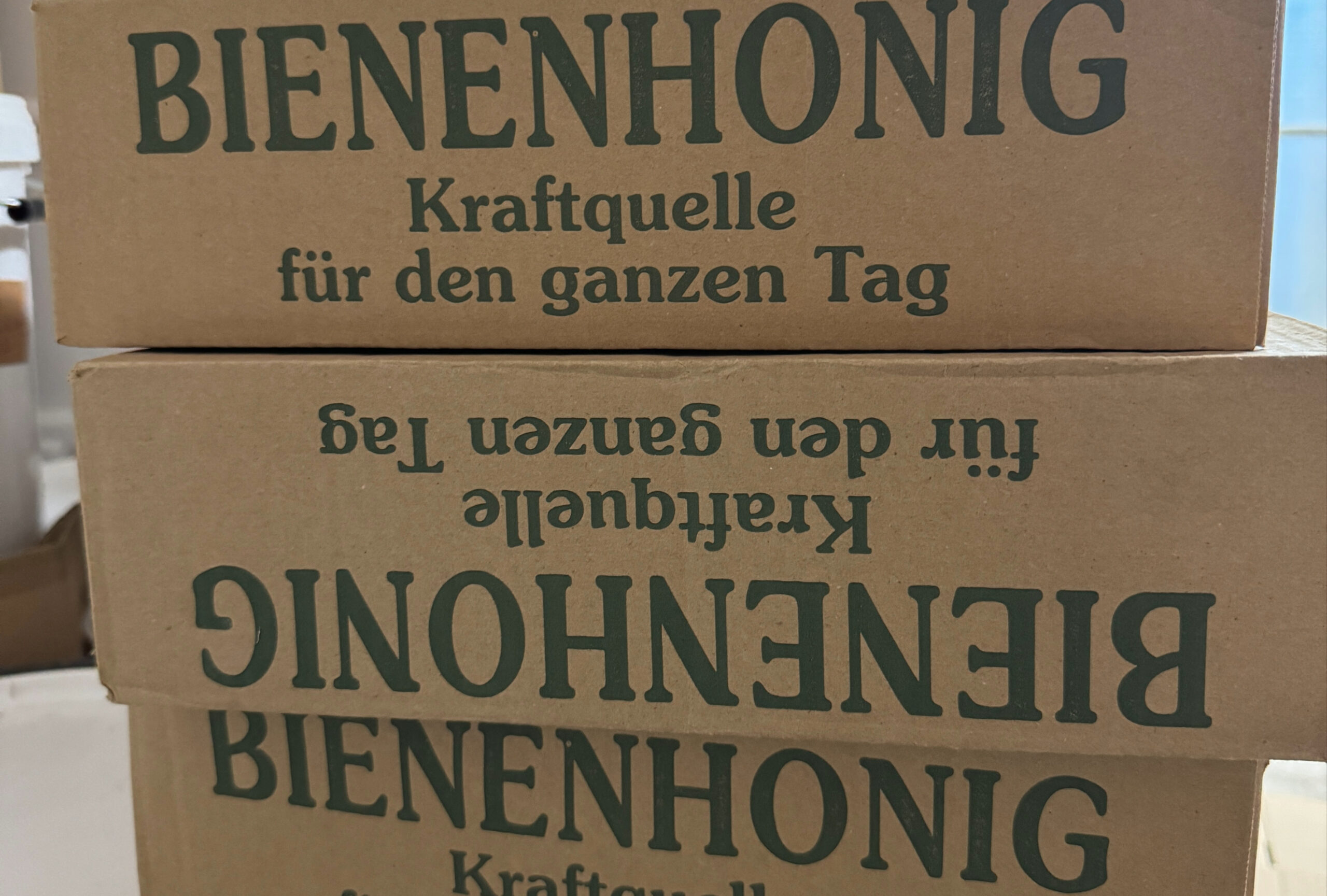Todavía le quedan 400 kg de miel por envasar en los próximos días. También vende la miel en su propia tienda en la calle principal de Wiepke. Al ser una tienda de autoservicio, puedes buscar con tranquilidad, independientemente del trabajo diario de Linda o Tilmann. Si no puedes ir a la región de Altmark pronto, puedes adoptar una de las colmenas de Tilmann a través de CrowdFarming. En la sala de preparación, vemos baldes de miel y metros de cintas con etiquetas personalizadas, cada una con el nombre de una colonia de abejas.