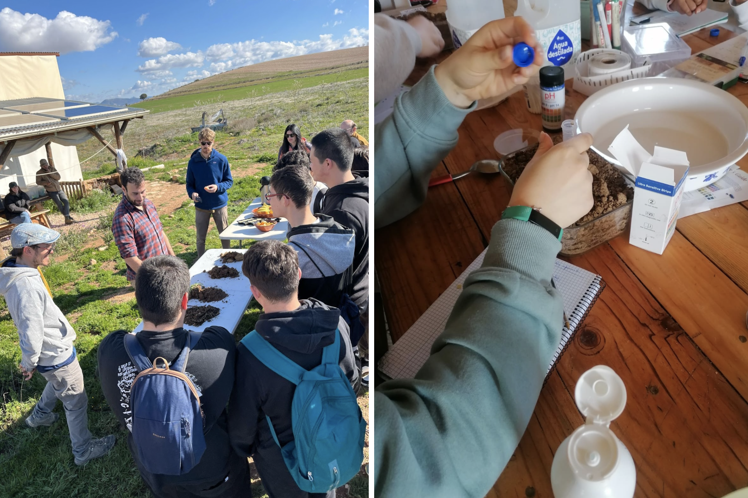 En el corazón de Viva el Campo se encuentra un mini programa de investigación. Cada grupo de estudiantes desarrolla un pequeño experimento práctico: comparar la retención de humedad de suelos con y sin cubierta vegetal, observar la biodiversidad en diferentes hábitats o probar cómo las prácticas regenerativas influyen en la absorción de agua. Guiados por agricultores de La Junquera y educadores como Jacobo, recogen datos, analizan resultados y comparten sus hallazgos al final de la semana. El experimento se lleva a cabo en tres parcelas con diferentes métodos de manejo: no intervención, regenerativo y convencional versus orgánico. Los estudiantes recolectan muestras de suelo con barrenas y palas, y analizan indicadores como el pH, la humedad, los nutrientes (NPK) y la actividad microbiana. También utilizan técnicas como trampas para invertebrados, pruebas de infiltración, cultivos de microorganismos, mediciones de respiración del suelo y análisis de biomasa. Los datos se analizan y comparan en clase, donde los estudiantes elaboran un breve informe científico. En él, presentan sus conclusiones, explican el proceso de investigación y reflexionan sobre el impacto de las prácticas agrícolas en la salud del suelo. Este ejercicio fortalece sus habilidades científicas y les permite comunicar los resultados obtenidos en el campo de manera rigurosa y accesible.