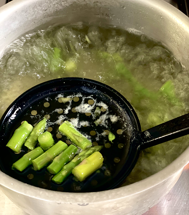 En esa misma agua (¡porque todos aquí somos ahorradores de agua profesionales!), hierve los espárragos unos 3-4 minutos y repite el mismo proceso que los guisantes. Resérvalos junto con los guisantes. ¡No tires el agua todavía!