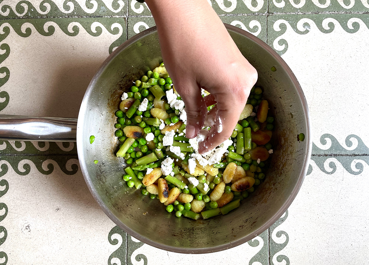GNOCCHI DE PRIMAVERA (ESPÁRRAGOS, GUISANTES, LIMÓN, FETA Y MENTA)