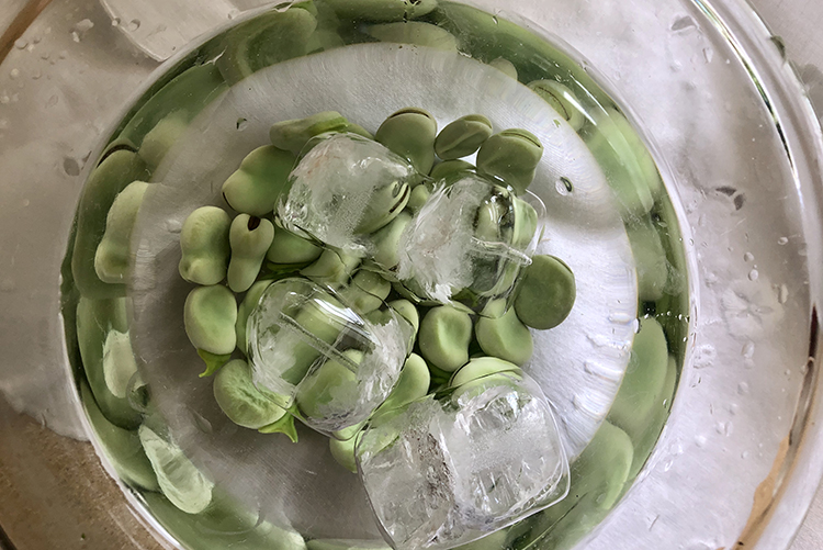 Limpiar y cortar la alcachofa en pequeñas cuñas o si se prefiere en láminas. Santi Cordón, al frente del restaurante Trinquete, en Tudela, recomienda dar un hervor a las habitasdurante 5 o 10 segundos con el agua muy caliente y un chorrito de vinagre”, retirar a un recipiente con agua muy fría con hielo “y así, con solo un poco de presión en la parte de abajo se van a repelar solas”.