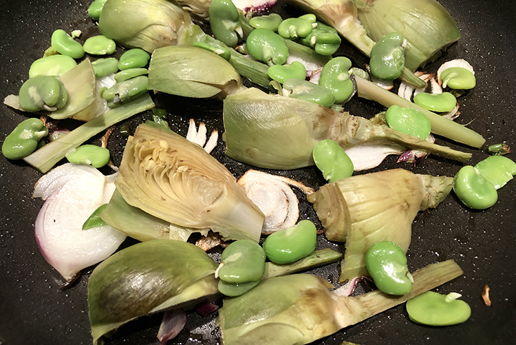 Rehogar un diente de ajo en aceite de oliva e incorporar las alcachofas y sazonar. Una vez se hayan dorado, añadir medio cazo de agua y cubrir con la tapadera para que se cocinen alrededor de 5 minutos, dependiendo cómo de tiernas se prefieran. Retirar las alcachofas y junto con las habas y la cebolleta, añadirlas al huevo batido y en la sartén con poco aceite cuajar consiguiendo una tortilla consistente.