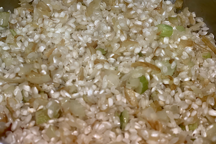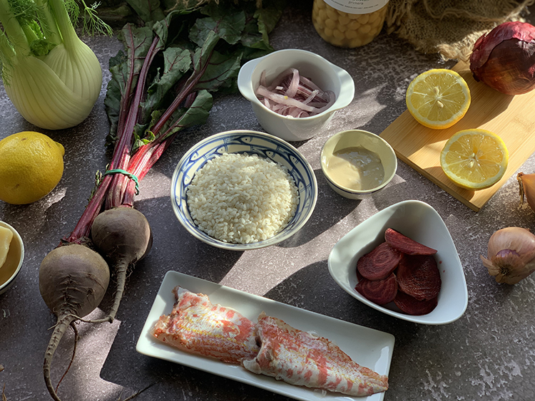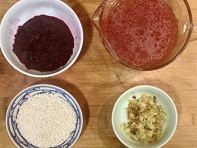 Toca el turno para el arroz, que lo sofreiremos primero con un sofrito de hinojo y cebolla bien picadas. Lo cocinamos durante 16 minutos y lo retiramos del fuego para añadirle la crema de remolacha y emulsionarlo bien.