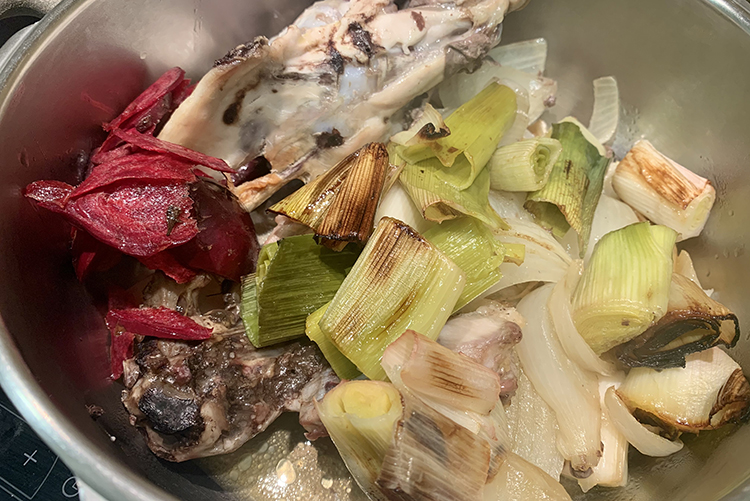 Comenzamos preparando el caldo de pollo asando las carcasas de pollo y las verduras a 200ºC hasta que estén bien doradas. Ponemos las carcasas a calentar con el agua y vamos espumando antes de que empiece a hervir y añadimos las verduras. Cocinamos durante 3 horas a fuego suave, colamos y reservamos. Al día siguiente, eliminamos la grasa sobrante.