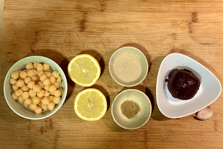 Aparte, asamos la remolacha envuelta en papel aluminio hasta que quede lo suficientemente cocida como para hacer un “puré”. Después trituraremos bien los garbanzos y las remolachas con el juego de limón, la sal, el ajo y la pimienta hasta que la textura quede súper lisa y homogénea. En un bowl con un batidor incorporamos la tahina y el aceite de oliva y guardar en frío. Se puede conservar en la heladera por 3 días, a la hora de servir pondremos una generosa porción de hummus y le daremos forma de “volcán” con un hueco en el medio donde podamos colocar aceite de oliva extra virgen y los toppings que queramos. Como acompañamiento el pan pita es el que mejor le va pero se puede recurrir al de preferencia.