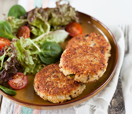 PASO 4: Servir las hamburguesas de quinoa acompañadas de una ensalada verde.