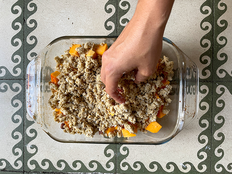 7- Espolvorea encima de la calabaza el crumble y coloca un papel de aluminio encima. Hornea por 40 minutos y por los últimos 10 minutos quita el aluminio para que el crumble se haga doradito.