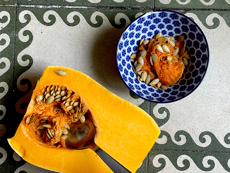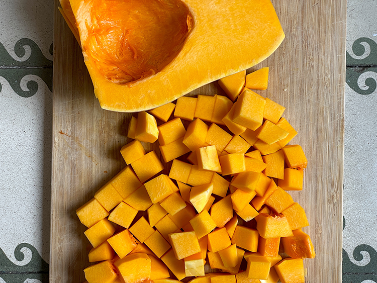 1- Corta tu calabaza en cubitos (quita las semillas del centro con una cuchara y guárdalas si lo deseas. Tienes que lavarlas y después, ¡las puedes freír con sal y especias!)