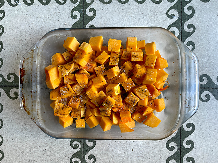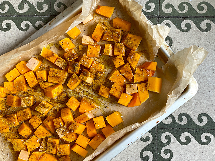 5- Coloca los cubos de calabaza en una fuente para hornear con sal, pimienta y el polvo de curry / ras al hanut, mezcla todo bien y hornea a 200°C por 15-20 minutos hasta que estén dorados y suaves por dentro.