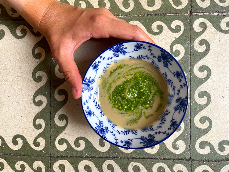 6- Para la salsa, simplemente exprime en un bol chico el limón, agrega el tahini y el pesto y revuelve bien.