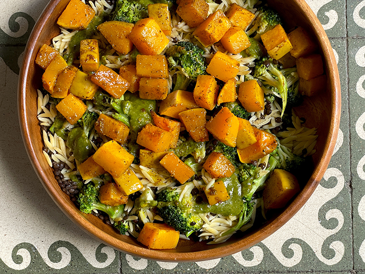 Ensalada de orzo de lentejas, calabaza y brócoli con salsa de tahini y pesto