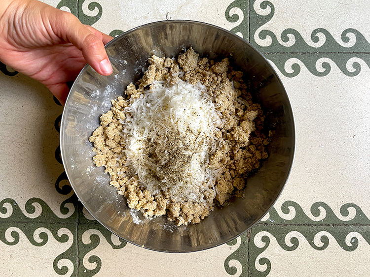 4- Para preparar el crumble, agrega en un bol mediano: la mantequilla, las harina, ½ cdita de sal, 1 cdita de pimienta y el parmesano rallado.